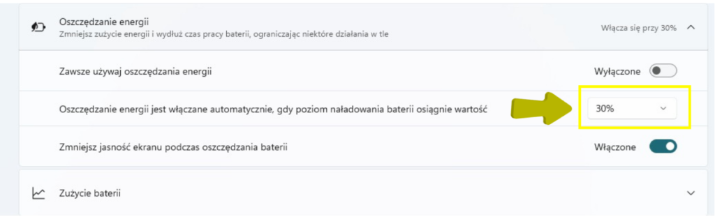 - Ustaw próg (np. 30%), przy którym system sam włączy tryb oszczędzania.