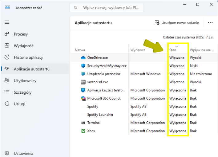 - Ctrl + Shift + Esc → Menedżer zadań → zakładka Uruchamianie.