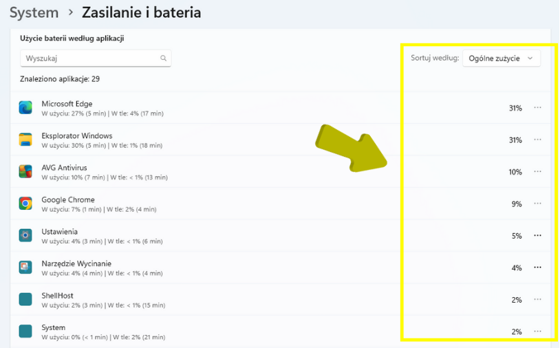 - Ustawienia → System → Zasilanie i bateria → Zużycie baterii przez aplikacje.